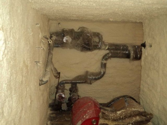 - Напыление ППУ. Материал состоит из двух компонентов, которые смешиваются в специальной установке высокого давления и сразу же наносятся на стену.