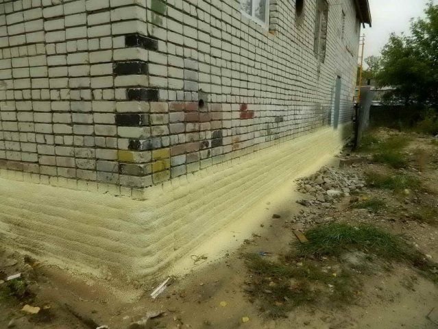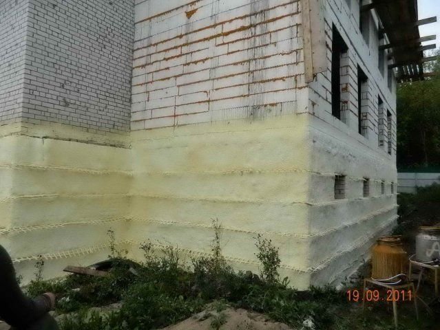 - Легкость установки: материал легко наносится специальным распылителем и покрывает любой рельеф поверхности ровным слоем, заполняя все щели. При этом утеплить цоколь можно как снаружи, так и внутри.